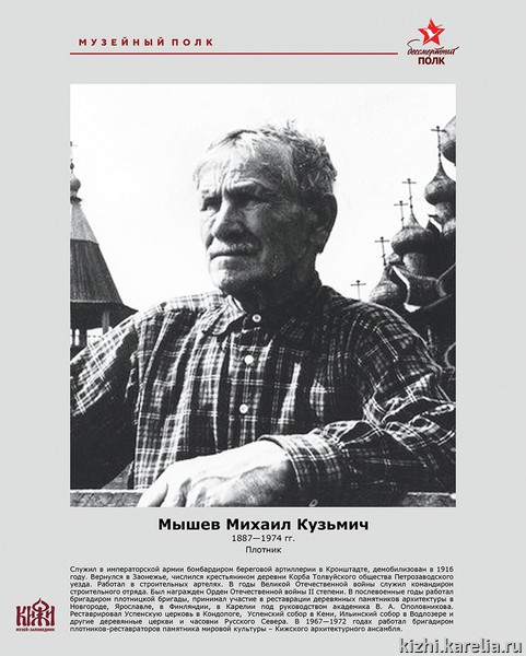 Рубрику «Кижский музейный полк», посвященную сотрудникам музея «Кижи», принимавшим участие в Великой Отечественной войне и в восстановлении объектов культурного наследия в послевоенный период, продолжает плотник-реставратор Михаил Кузьмич Мышев (1887—1974), прошедший две мировые войны.