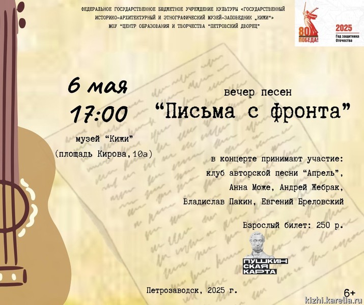 Открывает список мероприятий МУЗЫКАЛЬНАЯ ВСТРЕЧА «ПИСЬМА С ФРОНТА», которая состоится завтра 6 мая 2025 г. в 17:00 в Фондохранилище музея на площади Кирова, 10 при участии учеников и преподавателей клуба авторской песни «Апрель» (Центр образования и творчества «Петровский Дворец») и бардов Петрозаводска.