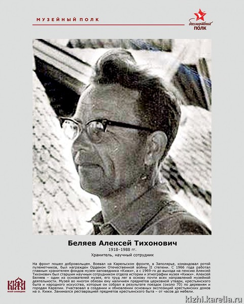 Рубрику «Кижский музейный полк», посвященную тем, кто победил фашизм на фронте и посвятил себя сохранению культурного наследия после войны, продолжает один из основателей музея «Кижи» Алексей Тихонович Беляев (1918–1988).
