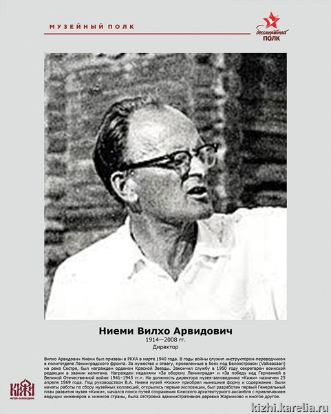 Рубрику «Кижский музейный полк» — о тех, кто воевал на Великой Отечественной и посвятил себя служению культуре после войны — продолжает второй директор музея-заповедника «Кижи» Вилхо Арвидович Ниеми (1914—2008).