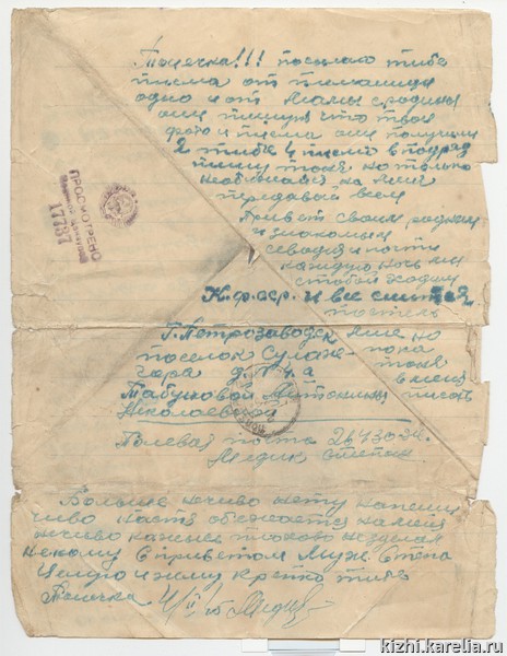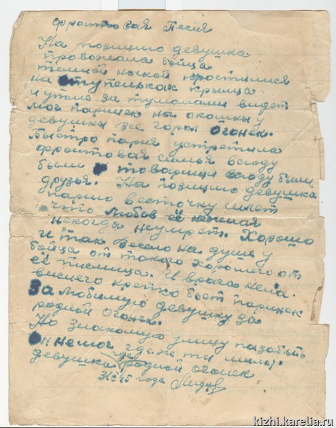 Антонина и Степан поженились в апреле 1943 года в оккупированном Петрозаводске. В письме-треугольнике от 3 февраля 1945 г. он шлет жене слова полюбившейся фронтовой песни. Письмо молодого человека проникнуто любовью, заботой о близких, мечтой о встрече. Через месяц его не станет.