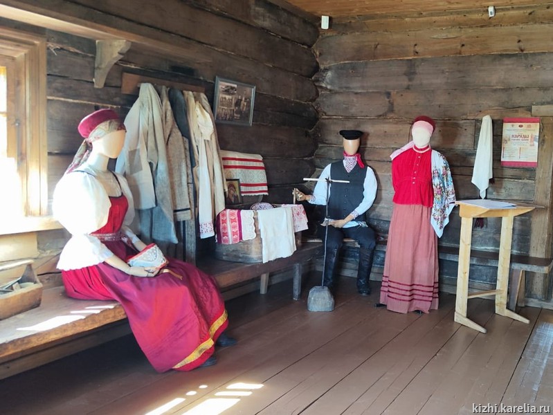 На выставке показаны повседневная рабочая одежда и праздничные наряды жителей старинного дома Бутина на севере острова Кижи.