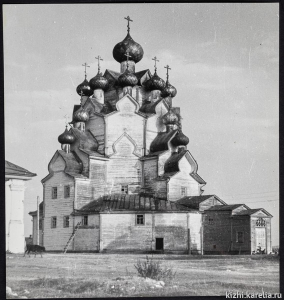 Фото поступили в фонды музея «Кижи» в 2023 году от Валерия Александровича Цыганова. Снимки храма с разных ракурсов выполнены архитектором Александром Викторовичем Ополовниковым в 1955 году для использования при проведении реставрационных работ. Перед нами восточный фасад и вид с северо-запада.