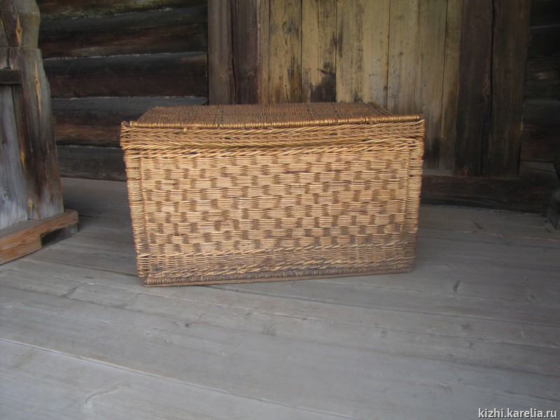Корзина высокая прямоугольная с прямыми стенками и надвязкой края борта. Для придания жёсткости в углы корзины вставлены круглые черемуховые стойки, вдоль продольных стенок пропущены широкие плоские планки. На основании укреплены продольные узкие деревянные планки. Крышка откидная с низким бортиком. Плетение корпуса выполнено в виде мелких и частых прямоугольников. На крышке четыре поперечные косички. Ручки — боковые, витые из прутьев, петли — из древесных лент. Замка нет.