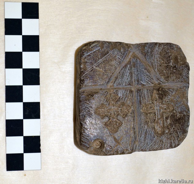 Для отливки крестов использовались особые формы. На квадратном сланцевом бруске видны два углубления в виде крестов. Канавки-литники для заливки медного сплава пересекаются под прямым углом и по диагонали. Форма выполнена в технике резьбы по камню. Получена музеем как дар от Егора Григорьевича Тестенникова (1883–1977 гг.) в 1967 г. Вместе с супругой Татьяной Игнатьевной (1898 — нач. 1980-х гг.) они всю жизнь прожили в Заонежье, в деревне Боярщине, занимались сельским хозяйством, воспитали 14 детей.