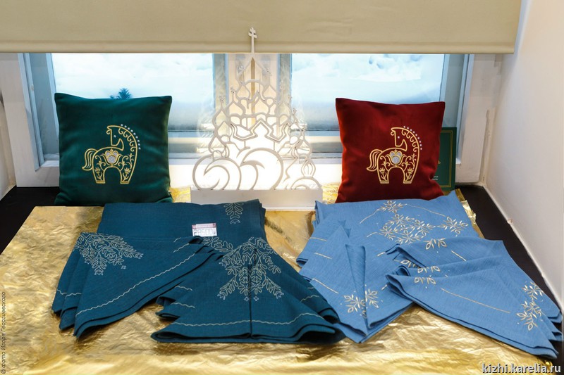 - Изделия из текстиля: яркие расписные подушки, льняные салфетки, скатерти и косметички с традиционным северной вышивкой золотом.