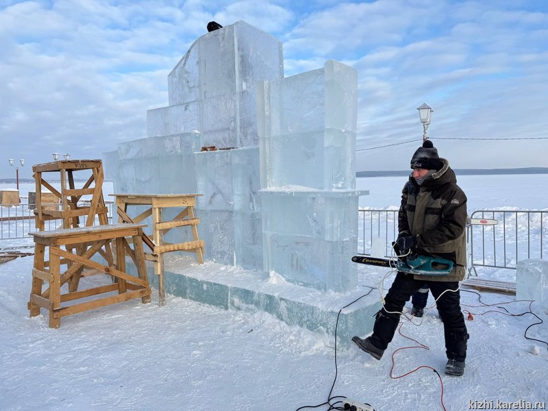 Масштабную композицию изо льда к 60-летию музея-заповедника «Кижи» строят на набережной Онежского озера у мэрии Петрозаводска.