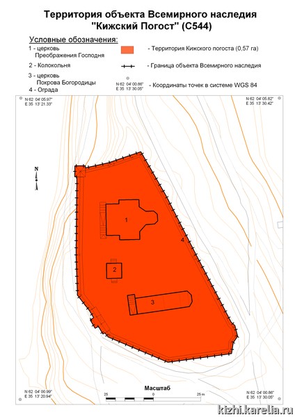 Кижский погост уже несколько сотен лет является доминантой целостной территории. В плане три основные сооружения стоят в вершинах треугольника, что создает целостность зрительного образа. До настоящего времени сохранились структура деревень и ландшафт, отражающие систему традиционного крестьянского землепользования, которые не нарушены современным строительством. Для сохранения этого, необходимо контролировать деятельность в непосредственной близости объекта и его окружения составляющие.