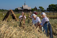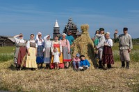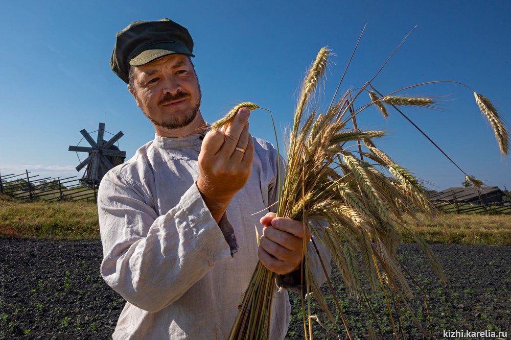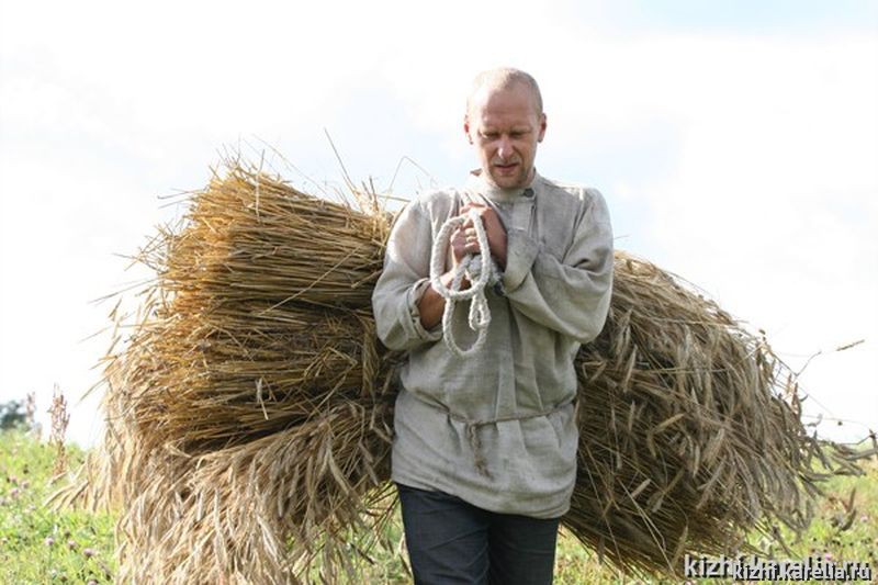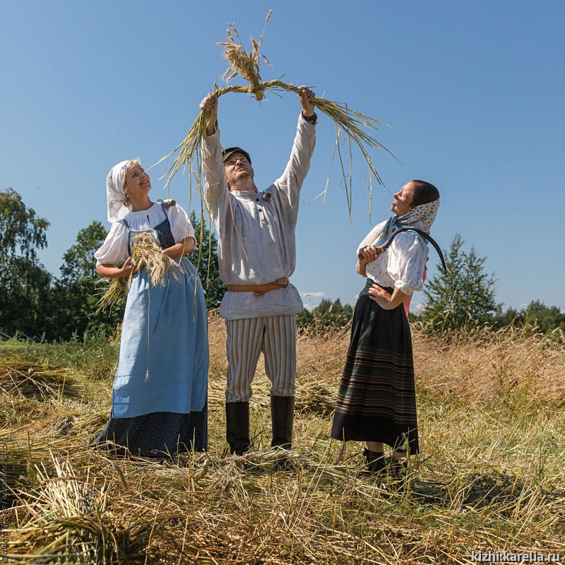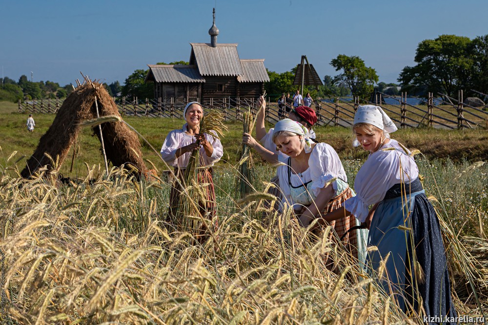 На острове Кижи в это время, как и сотни лет назад, у самых стен Кижского погоста на поля выходят жнеи и жнецы. Под народные песни они серпами срезают колосья, вяжут снопы и собирают «бабки» на просушку.