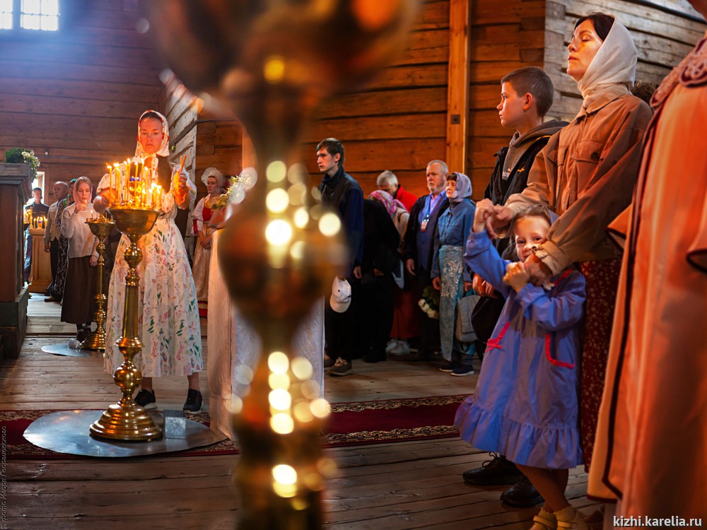 Именно в этот день раз в году происходит служба в старинном 22-главом храме Преображения Господня. После Божественной литургии происходит освящение плодов нового урожая, а также вокруг Кижского погоста проходит Крестный ход.