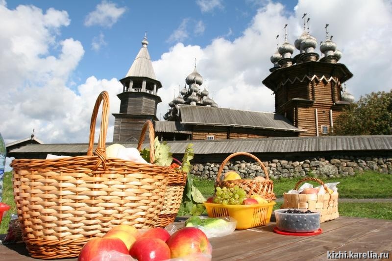 Главный праздник на острове Кижи - Преображение Господне. Он отмечается 19 августа. Пока Преображенская церковь закрыта на реставрацию, торжественная служба в этот день проходит в украшенной цветами Покровской церкви. После службы освещаются плоды нового урожая: яблоки, виноград и другие дары природы. Крестным ходом с хоругвями и иконами, с церковными песнопениями обходят прихожане с причтом вокруг Спасо-Кижского погоста.